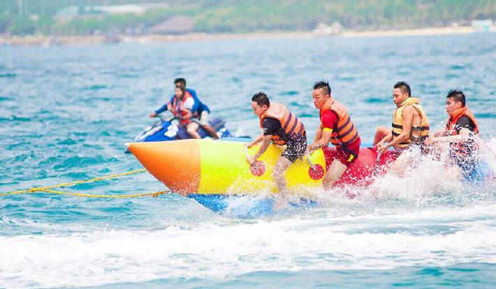 Tại bãi, quý khách còn có thể chơi các hoạt động thể thao nước như lặn ngắm san hô, dù bay, moto nước, thuyền chuối (có phụ thu)