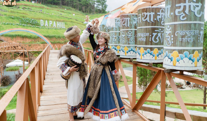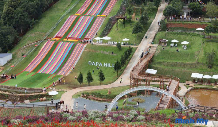 09h30: Xe đưa quý khách ghé tham quan KDL DAPA HILLS. Dapa Hill Đà Lạt là địa điểm du lịch mới được nhiều người quan tâm trong thời gian gần đây. Nằm trên đường vào khu du lịch Tà Nung, Dapa Hill là sự kết hợp giữa không gian mang phong cách Tây Bắc, tiểu cảnh đẹp mắt, khu đồi hoa rộng lớn, trò chơi khô nổi thú vị Air Slide và vườn thú đa dạng các loài vật