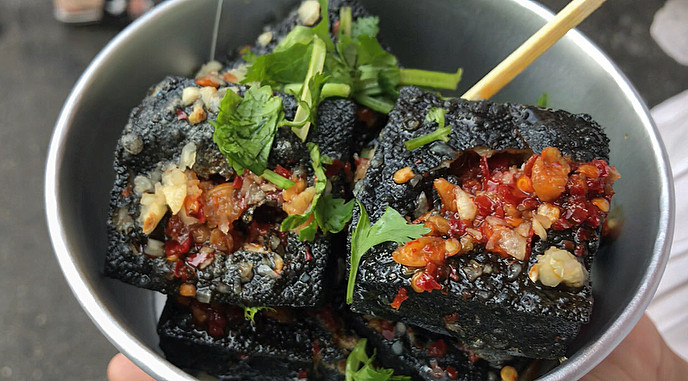 Đậu phụ thối là món ăn đường phố gây tò mò nhất. Mùi khá nồng nhưng vị béo, bùi, ăn quen sẽ rất cuốn.