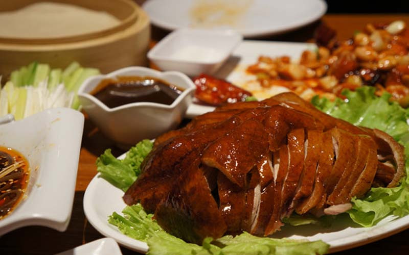 Vịt quay Bắc Kinh nổi tiếng với lớp da giòn, thịt mềm, ăn kèm bánh tráng mỏng và nước sốt đặc trưng. Đây là biểu tượng của ẩm thực Trung Quốc và thường xuất hiện trong các bữa tiệc quan trọng.