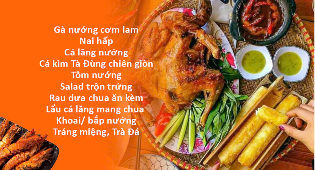 Quý khách thưởng thức TIỆC TỐI THỊT RỪNG TRỊ GIÁ 350K/KHÁCH với các món đặc sản núi rừng như Gà Nướng Cơm Lam, Cá Rô Hồ Tà Đùng…